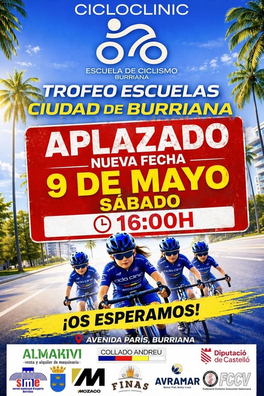 Debido a la alerta de lluvia prevista para este fin de semana el Trofeo Escuelas de Ciclismo Ciudad de Burriana ha sido aplazado al 9 de mayo. La competición dará comienzo a las 16 horas en la Avenida de París de la localidad castellonense.