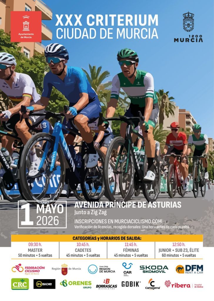 El viernes, 1 de mayo, se disputa el XXX Critérium Ciudad de Murcia para las categorías Élite-Sub23, Máster, Cadete y Júnior, tanto masculina como femenina. La competición tendrá lugar en la Avenida Príncipe de Asturias junto a Zig Zag. LISTA DE INSCRITOS
