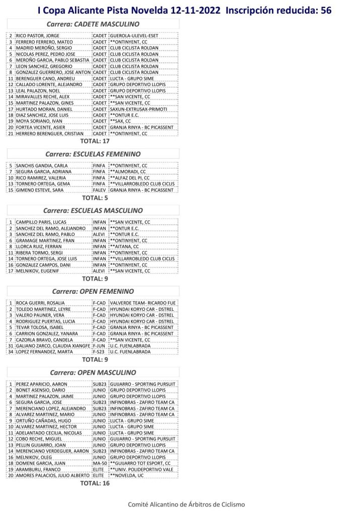 Tras su participación en el Europeo de Namur regresan el domingo a la competición nacional Raúl Mira (Teika) y David Ivars (Teika). También estarán Óscar Orts (GD Llopis), Luis Bernabéu (Esetec Pikolinos), Daniel Pérez (Infinobras), Raquel Pérez (AM Sonido), Vania Rico (Teika) y Selena Maza (Valverde). A nivel de la Comunitat tampoco faltarán a la cita Sara Bonillo (Cx Sueca), como líder de la categoría sub 23, Héctor Calatayud (Triasport), Sofía Rodríguez (Nesta), Leyre Almena (Teika), David Calatrava (Juan Giner), Mirian Guerrero (Triasport), Marc Iborra (Triasport), Iván Martín (Triasport), Laia Canet (Triasport), Julen Moltó (Amiñur), Jordi Sánchez (Amiñur), Eric Igual (Teika), Pablo Machancoses (Triasport), Asier Ortega (Teika), Jordi Fournies (Stefano Garzelli), Carlos Macías (Amiñur), Adrián Valle (Teika), Lluna Hervás (Carlet), Aroa Rodríguez (Triasport), Martí Bravo (CX Sueca), Pablo Calvo (Teika), Anna Quintero (CX Sueca), Iván Gomar (Teika), Lidia Llacer (Triasport), Joan Llacer (Triasport), Alejandra Puente (Triasport) y Álex Sáez (Ontinyent). Acuden los élites Juan Martínez (València), Raúl de Mingo (Picassent) y Josep Llinares (La Vila).