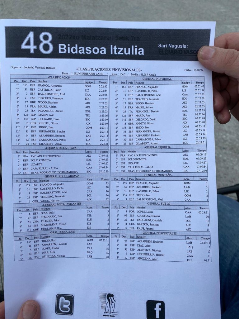 Alejandro Franco (Gomur) se ha impuesto en la primera etapa de la Bidasoa con salida en Irún y final en Irrisarri Land, tras 104 kilómetros. La meta estaba situada en el muro que da acceso al parque de la naturaleza en Igantzi.