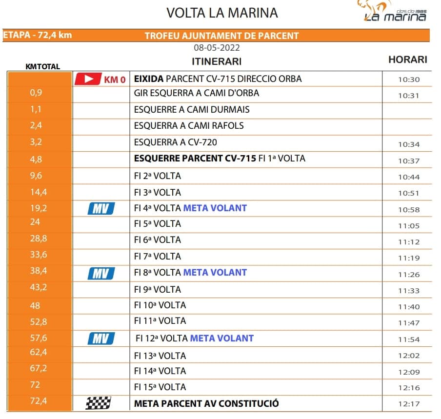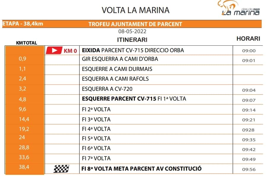 La última etapa de la Volta La Marina, suspendida por la lluvia, se celebra en Parcent el domingo 8 de mayo. Habrá dos carreras, una a las nueve, para mujeres y M60, de 39 kilómetros, y la otra, a las 10:30, para júniors, élite, sub23 y M30-40-50, de 73. El circuito estará cerrado al tráfico hasta el final de la segunda carrera.