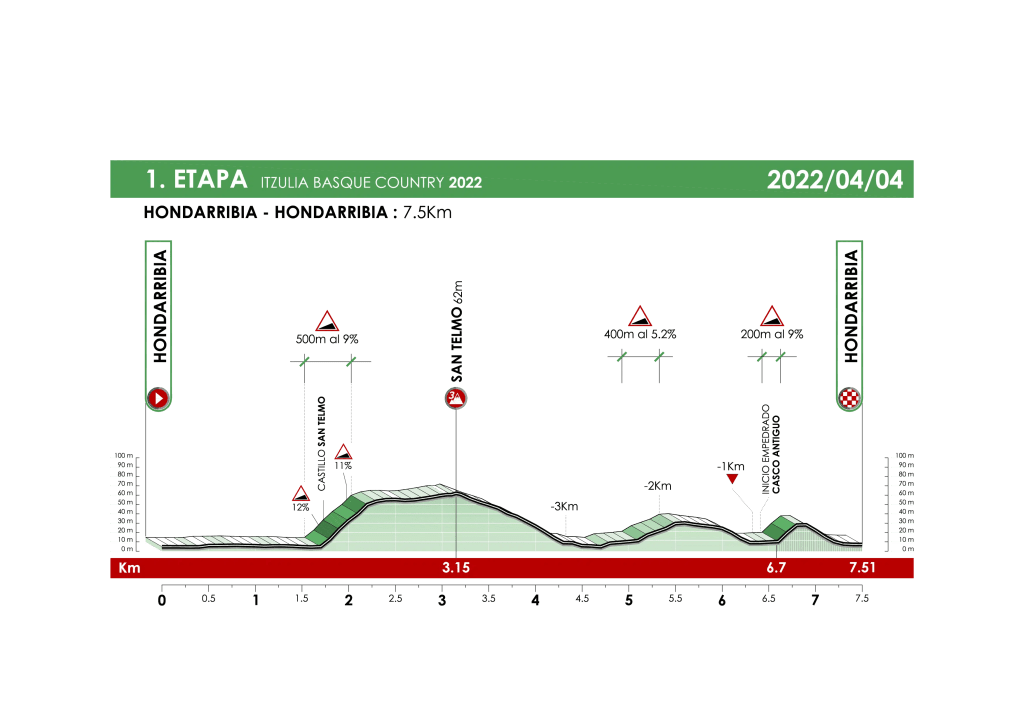 Primera etapa: HONDARRIBIA-HONDARRIBIA (CRI), que se disputa el lunes 4 de abril, con una extensión de 7,51 km. Se trata de una contrarreloj individual, donde para abrir la Itzulia se disputará una etapa muy corta con pequeños repechos. Su primera subida será puntuable para el primer maillot del premio de montaña. Habrá ciclistas que salgan a tope para conseguir el maillot de la montaña, se formaran pequeñas diferencias de tiempos para la clasificación general. A las 14.26 sale el primer corredor. ORDEN DE SALIDA