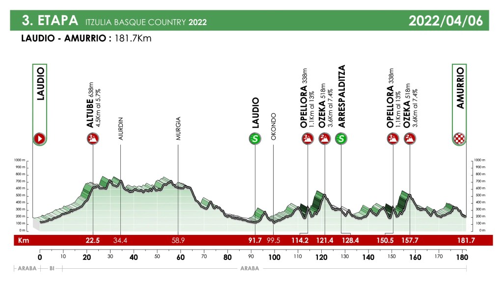 Tercera etapa: LAUDIO-AMURRIO, se disputa el miércoles 6 de abril con una extensión de 181,72 km. Se puede diferenciar dos partes, donde la 1ª es bastante sencilla hasta llegar a Laudio, pero en la 2ª parte se disputan a su vez 2 vueltas a un circuito muy “rompe-piernas” con carreteras estrechas y en la que habrá mucha tensión en el pelotón para intentar situarse en la cabeza de este.