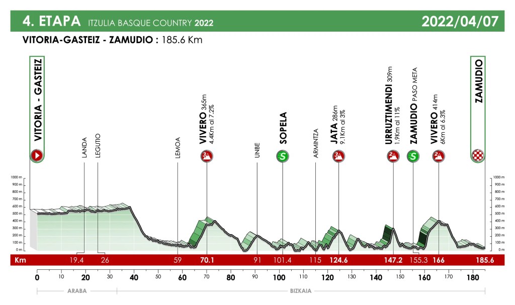 Cuarta etapa: VITORIA-GASTEIZ-INGETEAM PARKE ZAMUDIO, que se disputa el jueves 7 de abril, con una extensión de 185,60 km. Se trata de una etapa en la que habrá mucha pelea desde el inicio, por que puede llegar la fuga. Al final hay una subida exigente en la que los hombres de la general pueden hacer diferencias.