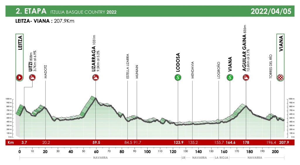 La segunda etapa, que se disputa el martes, es la más larga de esta Itzulia con salida en Leitza y llegada en Viana con 208 kilómetros de recorrido que presentan las subidas a Uitzi (3ª), Lizarraga (2ª) y Aguilar (3ª) a 30 de meta.