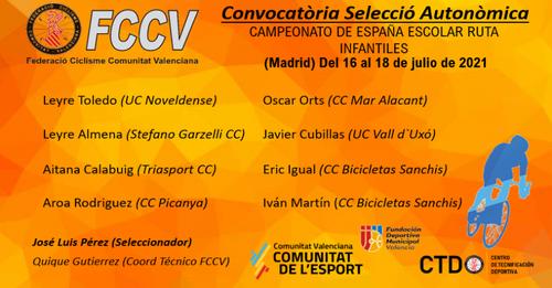 El seleccionador autonómico de Escuelas de Ciclismo de la Comunitat Valencian, José Luis Pérez, ha convocado a ocho ciclistas de categoría Infantil para el Campeonato de España Escolar de ruta que se disputará en la Comunidad de Madrid del 16 al 18 de julio. En la lista de elegidos se encuentra los alicantinos Leyre Toledo (Noveldense) y Óscar Orts (Mar Alacant). Junto a ellos estarán Leyre Almena, Aitana Calabuig, Aroa Rodríguez, Javier Cubillas, Eric Igual e Iván Martín. Como reservas figuran Lucía Rodríguez, del Club Ciclista San Vicente, y Lucas Gabaldón.