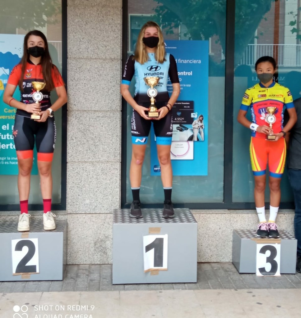 El podio femenino, con Alejandra Puente (Hyundai Koryo), Raquel Pérez (AM Sonido) y Claudia Xiangfe (GD Llopis).El podio masculino: Lluc Plana, Roger Pareta y Pablo Calvo. Foto. Ciclismo Levante