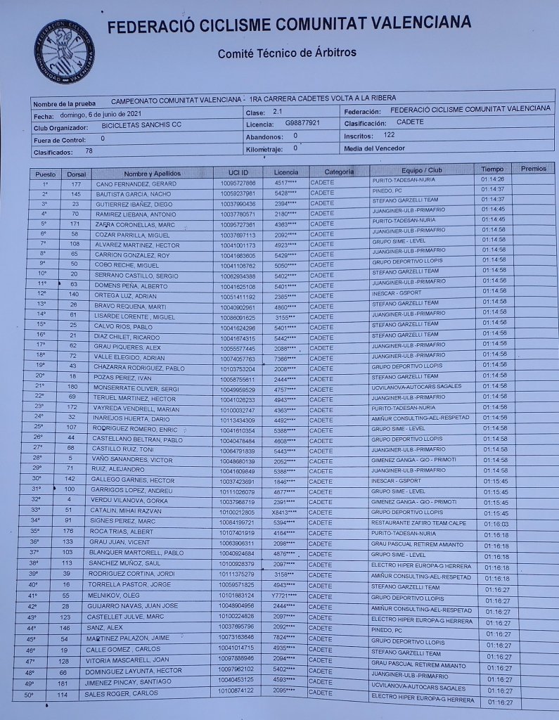 Gerard Cano (Purito Tadesan) se ha impuesto hoy en Sumacàrcer la I Volta a la Ribera. Nacho Bautista (Pinedo) ha sido segundo y se ha adjudicado el título de campeón autonómico cadete. Bautista ha estado acompañado en el podio por Diego Gutiérrez (Stefano Garzelli) y Antonio Ramírez (Juan Giner). Héctor Álvarez (Grupo Sime) ha sido séptimo y Miguel Cobo (GD Llopis), noveno.