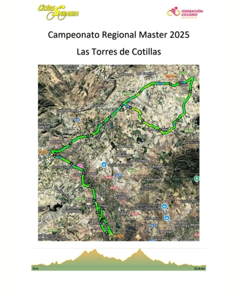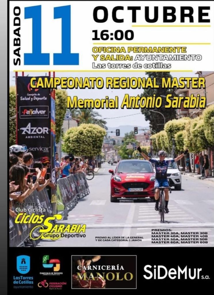 Este sábado, 11 de octubre, se disputa en Las Torres de Cotillas, a las 16 horas, el Campeonato Regional Máster-Memorial Antonio Sarabia. Organizado por el Club Ciclista Ciclos Sarabia, junto a la Concejalía de Deportes, repartirá los maillots de campeones de Murcia de las categorías Máster 30A/30B, 40A7B, 50A/B y 60A7B.