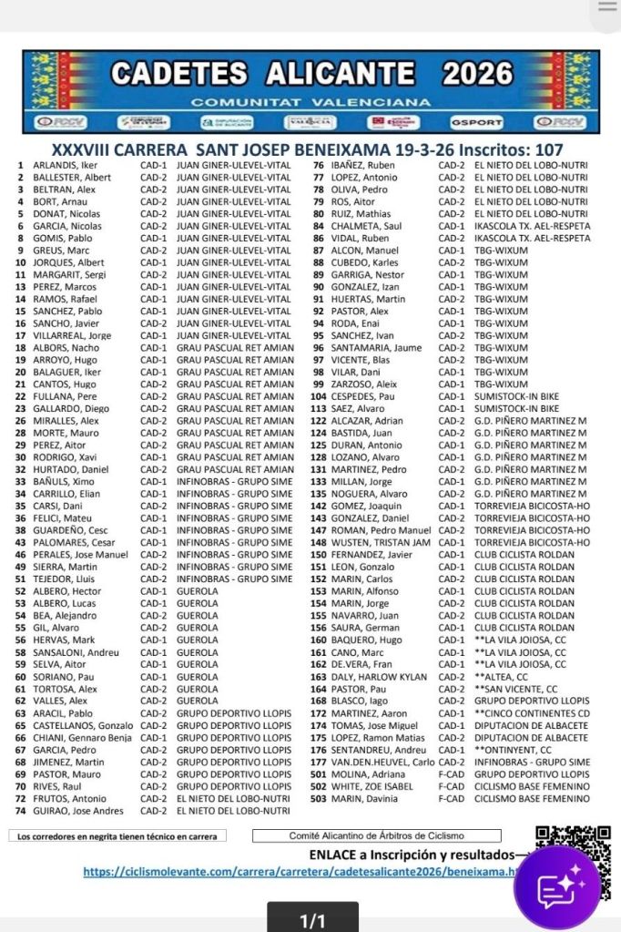 El jueves, día 19 de marzo, se disputa en Beneixama la XXXVIII edición de la Carrera de San Josep de Cadetes para la categoría Cadete. La prueba, organizada por el Club Ciclista Beneixama, dará comienzo a las 10:00 horas.