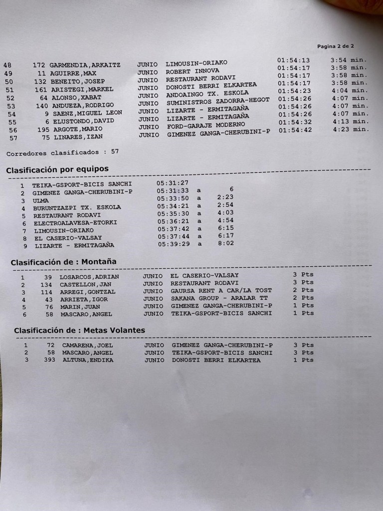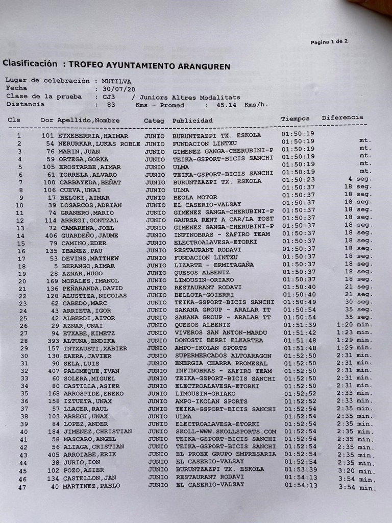 Otra gran actuación del corredor del Giménez Ganga. El regreso a la competición está siendo muy bueno, tras el parón provocado por el coronavirus. Ganó las dos pruebas que disputó el pasado fin de semana en Baleares, fue quinto en el Trofeo Virgen de Muskilda y, hoy, ha subido al podio en el Lacturale gracias al apoyo de sus compañeros. «Ha sido una carrera muy dura, con un nivel muy alto y donde el trabajo en equipo ha dado sus resultados”, reconoce el murciano. Entre los que han trabajado dentro del conjunto sajeño ha sido Izan Linares, que sufrió una caída en la jornada de Ochagavía y era duda para competir hoy. “Tenía alguna molestia, pero nada importante para ir en bici. Lo que pasa que en el kilómetro 60 me he visto obligado a abandonar. Mañana espero que vaya mejor”, dice el corredor de Alcoy.