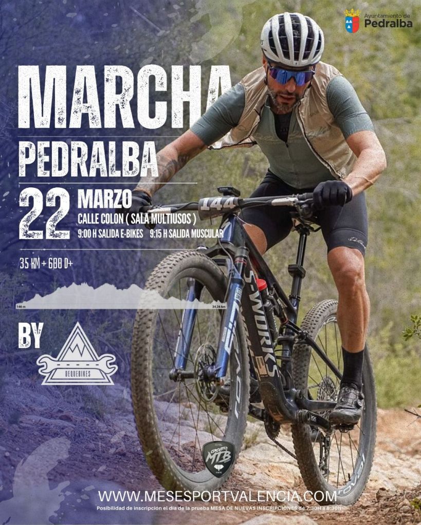 El domingo, 22 de marzo, se disputa, a partir de las nueve, la Marcha BTT Pedralba, prueba puntuable para el Circuito MTB Valencia Mes Esport. La salida se dará desde el Bar Aragó, en la Plaza Multiusos.