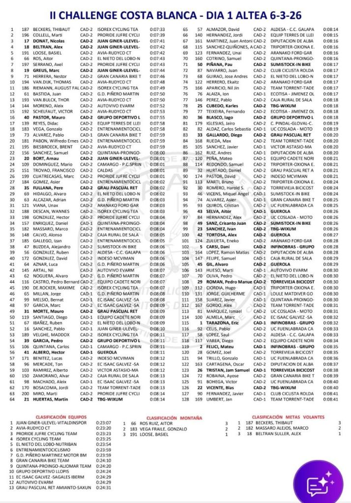 Thibaut Beckers, vencedor de la CRI de la primera jornada, mantiene el liderato. Beckers también domina las Metas Volantes; Ros, la Montaña; Beltrán, la Regularidad y el maillot del primer corredor de la Comunidad Valenciana. El Avia-Rudyco es el mejor conjunto.