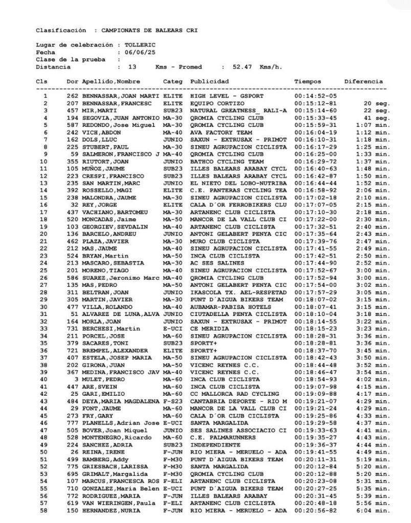 Xavi Arnal (JuanGiner Ulevel Vitaldinsport) es el nuevo campeón Cadete de la Comunidad de Contrarreloj. Se ha impuesto en la pimera manga de la prueba disputada en Xàtiva. Su compañero de equipo Vicent Andrés ha sido segundo y Oriol Blasco (Sumistock), tercero. También han conquistado el maillot autonómico Raúl Patiño (Horadada), en M50; Antonio Torres (Aquan), en M60; Héctor Acebedo (Sumistock), MC Escolar; Johannes Bertus (Van der Heijden), en MH3; y Pablo Torres (Unlimited), en MT1. Clasificaciones. Manga 1.