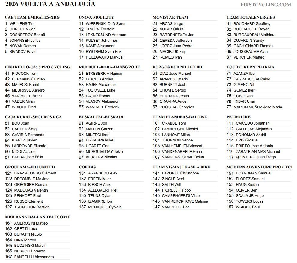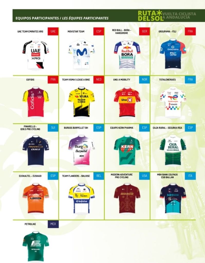 El francés Pavel Sivakov (UAE Team Emirates) y el británico Tom Pidcock (Q36.5 Pro Cycling) como principales estrellas favoritas. Tendrán competencia con Maxim Van Gils, que llega liderando al Red Bull Bora, a su compañero Tim Wellens o a los españoles Iván Romeo y Juanpe López, que están ya confirmados en el Movistar Team. Joan Bou defenderá los colores del Team Caja Rural-RGA.