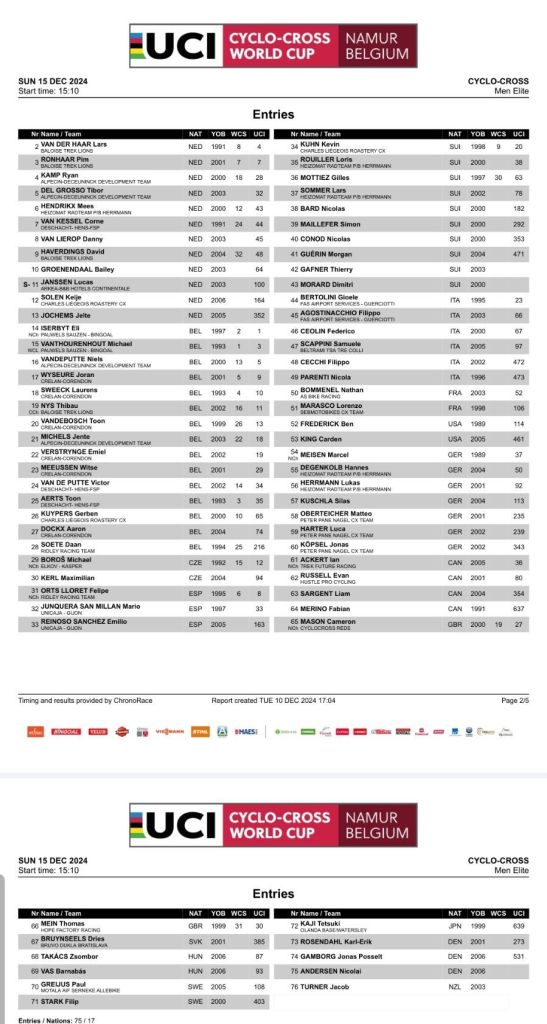 Namur acoge el domingo la cuarta prueba de la Copa del Mundo de ciclocross 2024-2025 tras la supensión de la de Cabras. Felipe Orts estará en la salida además de Mario Junquera y Emilio Reinoso. A pesar de las ausencia de Van der Poel, Van Aert y Pidcock compiten en la prueba Van der Haar, Ronhaar, Iserbyt, Vanthourenhout, Sweeck, Wyseure, Nys… Sara Cueto será la única representante nacional femenina.