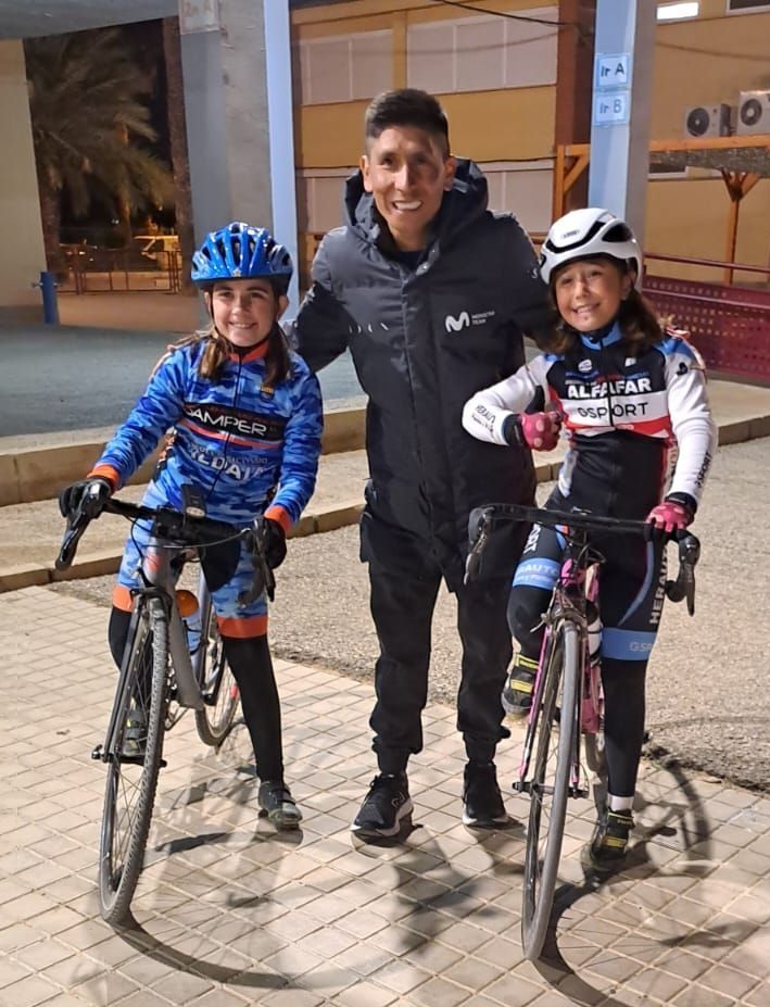 Los ciclistas del Movistar Team, Nairo Quintana y Pelayo Sánchez, estuvieron ayer en Alfafar, una de las zonas O de la última Dana producidas hace más de un mes en la provincia de València, haciendo felices a los más pequeños.