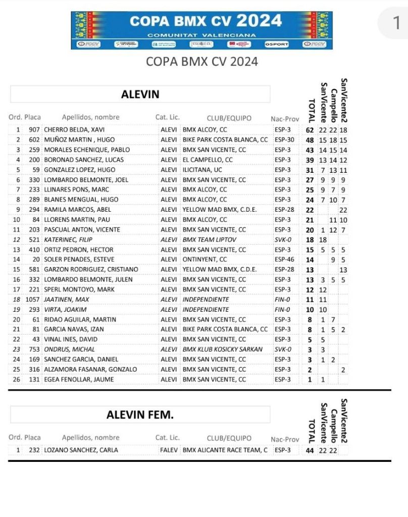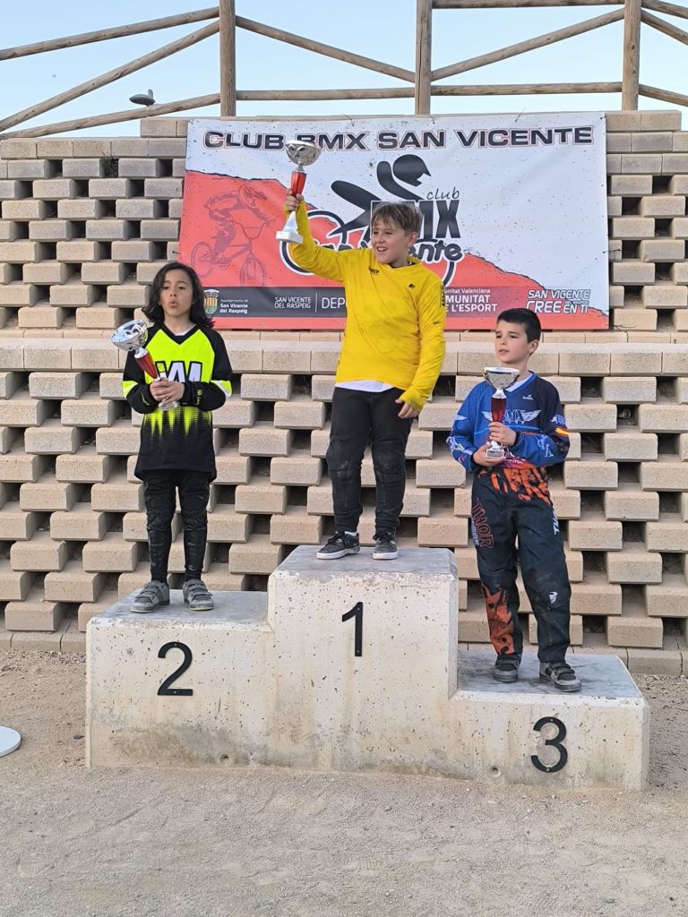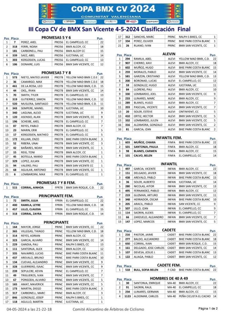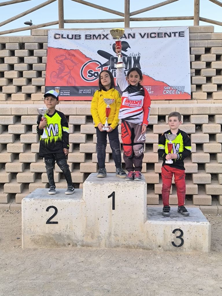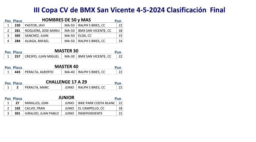 San Vicente de Raspeig vivió el sábado la tercera jornada de la Copa BMX de la Comunidad Valenciana con la presencia de 117 participantes. Axel Pérez se impuso en Promesas 5 y 6 (El Campello); Javier Nieto (Yellow) y Ainhoa Corral (BMX San Roque), en Promesas 7 y 8; Julia Smith (El Campello) y Jorge Mayor (BMX San Vicente), en Principiantes; Abel Ramis (Yellow), en Alevines; Chiara Muñoz (Bike Park Costa Blanc) y Vicente García (Alcoy), en Infantiles; Jaime Pastor (Biker Park Costa Blanca) y Belén Bull (Bike Park Costa Blanca), en Cadetes; Enrique Santonja (Alcoy), en Hombres, de 40 a 49; Javi Pastor (Ralph’s), en Hombres, de 50 y más; Juan Miguel Crespo (San Vicente), en M30; Alberto Peralta (Ralph’s), en M40; Marc Peralta (Ralph’s), en Challenge 17 a 19; e Izán Miralles (Bike Park Costa Blanca), en Júnior.