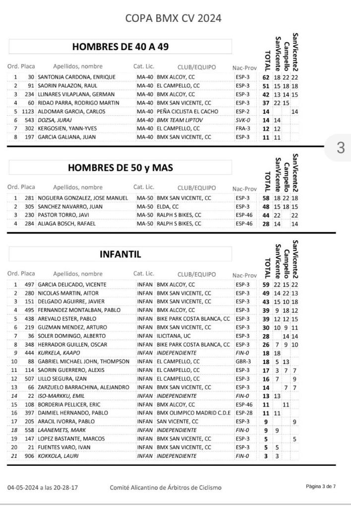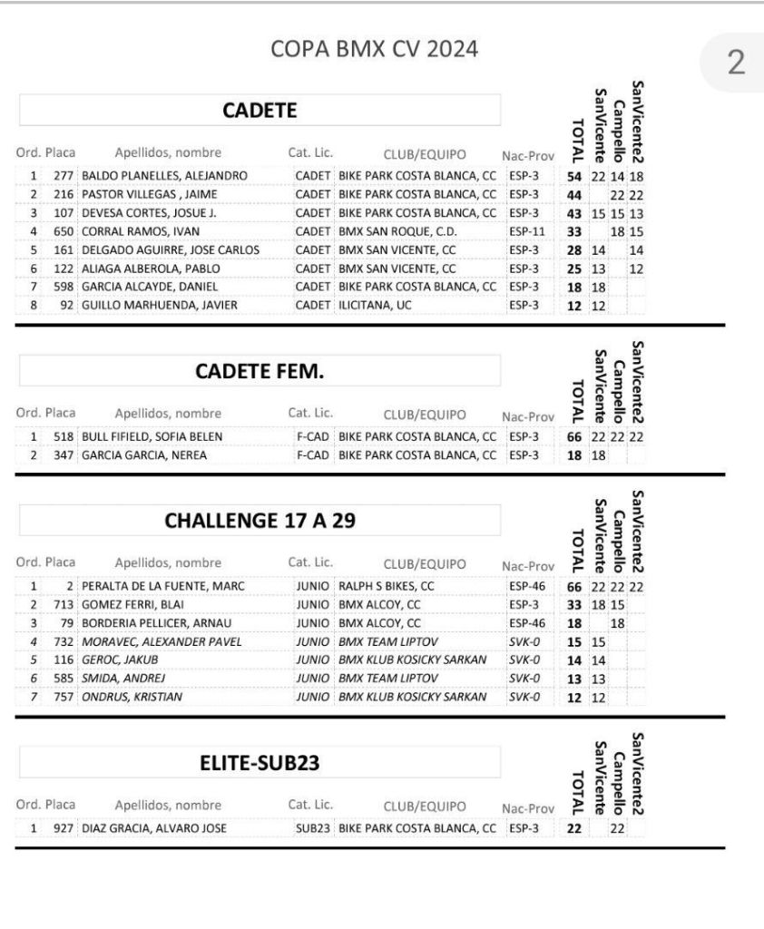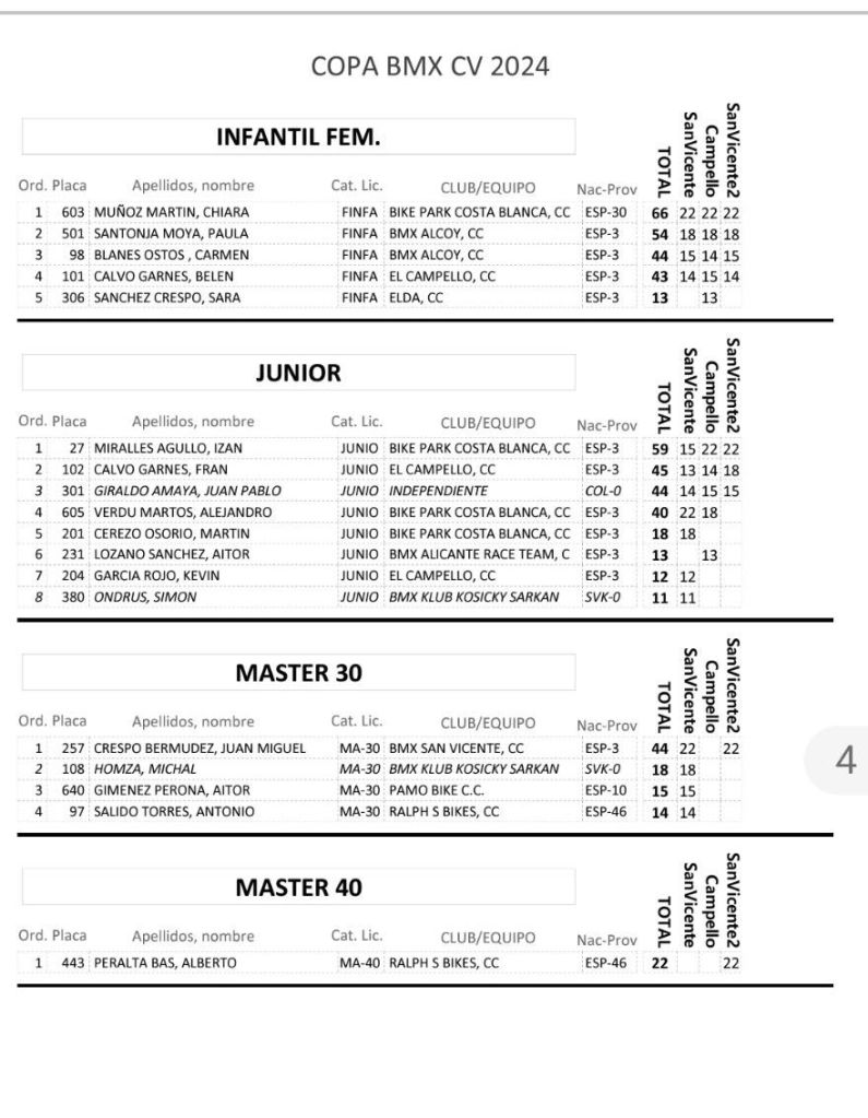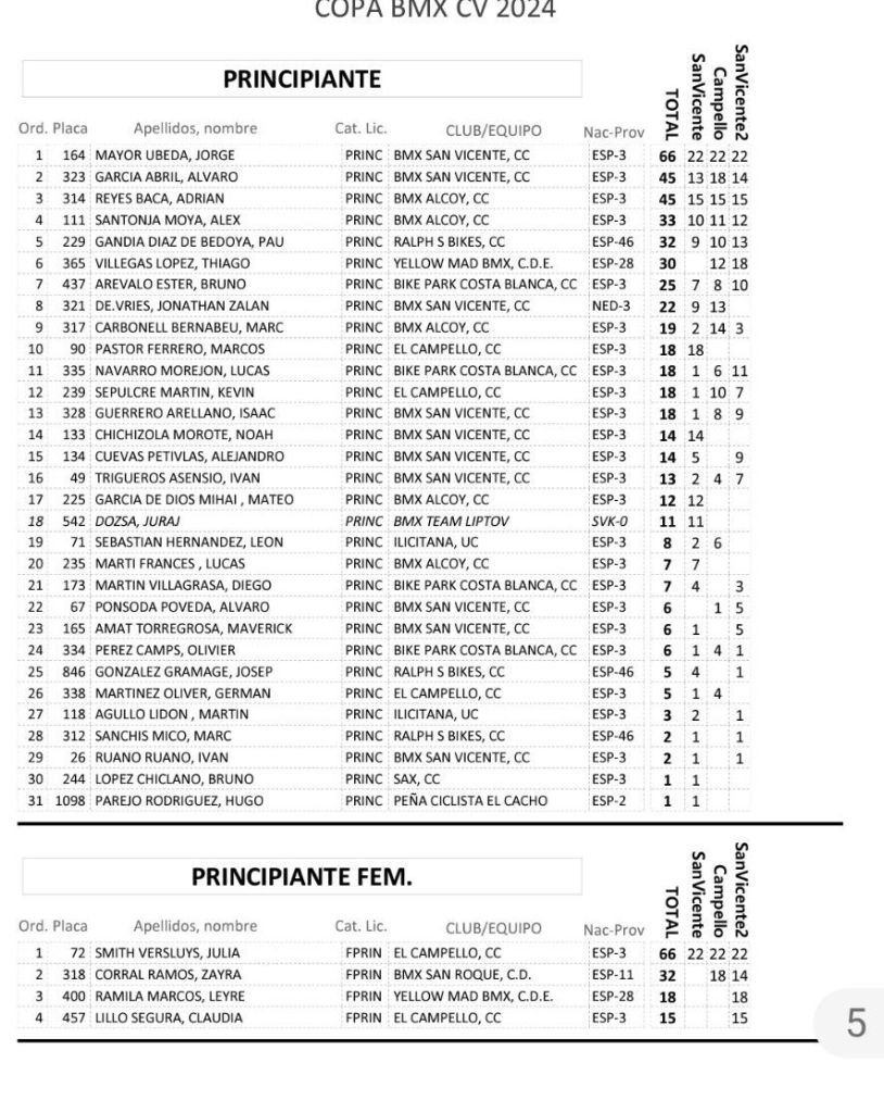 San Vicente de Raspeig vivió el sábado la tercera jornada de la Copa BMX de la Comunidad Valenciana con la presencia de 117 participantes. Axel Pérez se impuso en Promesas 5 y 6 (El Campello); Javier Nieto (Yellow) y Ainhoa Corral (BMX San Roque), en Promesas 7 y 8; Julia Smith (El Campello) y Jorge Mayor (BMX San Vicente), en Principiantes; Abel Ramis (Yellow), en Alevines; Chiara Muñoz (Bike Park Costa Blanc) y Vicente García (Alcoy), en Infantiles; Jaime Pastor (Biker Park Costa Blanca) y Belén Bull (Bike Park Costa Blanca), en Cadetes; Enrique Santonja (Alcoy), en Hombres, de 40 a 49; Javi Pastor (Ralph’s), en Hombres, de 50 y más; Juan Miguel Crespo (San Vicente), en M30; Alberto Peralta (Ralph’s), en M40; Marc Peralta (Ralph’s), en Challenge 17 a 19; e Izán Miralles (Bike Park Costa Blanca), en Júnior.
