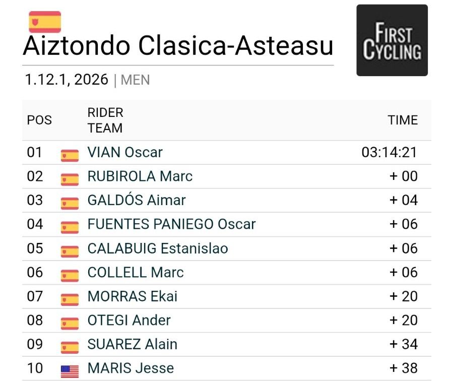 Reanudada la competición, todo ha quedado comprimido para un desenlace muy corto y explosivo. El trío formado por Otegi, Calabuig y Fuentes ha sido alcanzado justo antes de la subida definitiva y, en ese momento de duda, Vian ha encontrado el instante exacto para arrancar. Su ataque, lanzado al inicio de Larraul, ha terminado siendo definitivo: Rubirola se ha quedado muy cerca de darle alcance, pero ha tenido que conformarse con la segunda plaza, mientras que Aimar Galdós ha completado el podio.