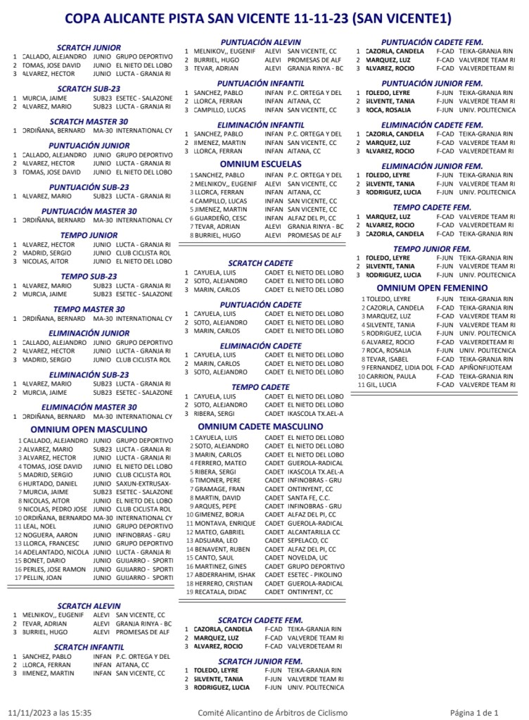 Hoy ha comenzado en San Vicente del Raspeig la II Copa Alicante de Pista SLT Sport en el Velódromo Manuel Guijarro. Los júniors, Alejandro Callado (GD Llopis) y Leyre Toledo (Teika Granja Rinya) y el cadete Luis Cayuela (El Nieto del Lobo) fueron los vencedores de las tres pruebas principales. Una competición en la que el sub23 Mario Álvarez (Lucta-Granja Rinya) y la cadete Candela Cazorla (Teika Granja Rinya) fueron los mejores en sus edades.