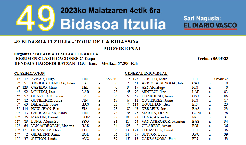 Hugo Aznar (Finisher) ha sido el ganador de la segunda etapa de la Bidasoa Itzulia que ha finalizado en el alto de Bagordi-Baztan. Ha superado a Julen Arriola-Bengoa (Caja Rural-Alea) y Marc Cabedo (Telco’m-ON Clima-Osès), que han entrado a meta en esa posición. Marc Cabedo (Telcom) se ha vestido de líder y Jaume Guardeño (Caja Rural-Alea), que hoy ha terminado quinto, comanda la clasificación de montaña.