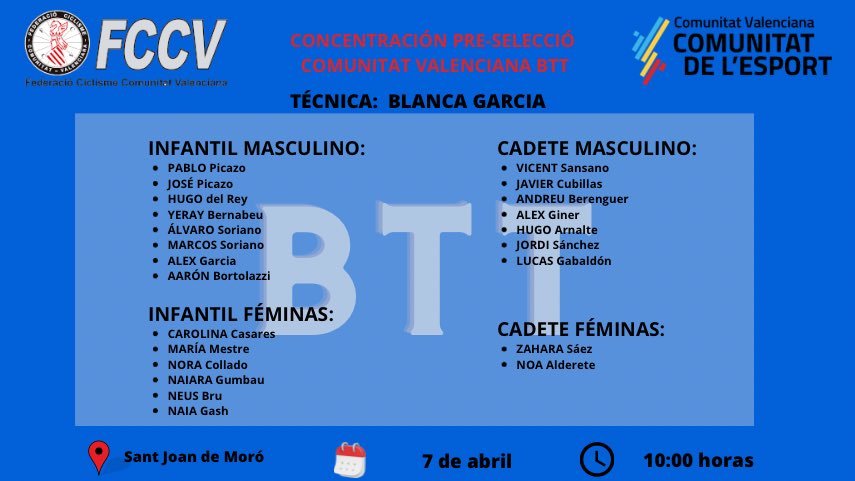 La seleccionadora de BTT de la FCCV, Blanca García, ha convocado diseñado una concentración de la preselección autonómica infantil y cadete con la mirada puesta en el Nacional. Será el viernes, 7 de abril, en Sant Joan de Moró, aprovechando las vacaciones escolares. La cita es a las 10 horas
